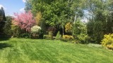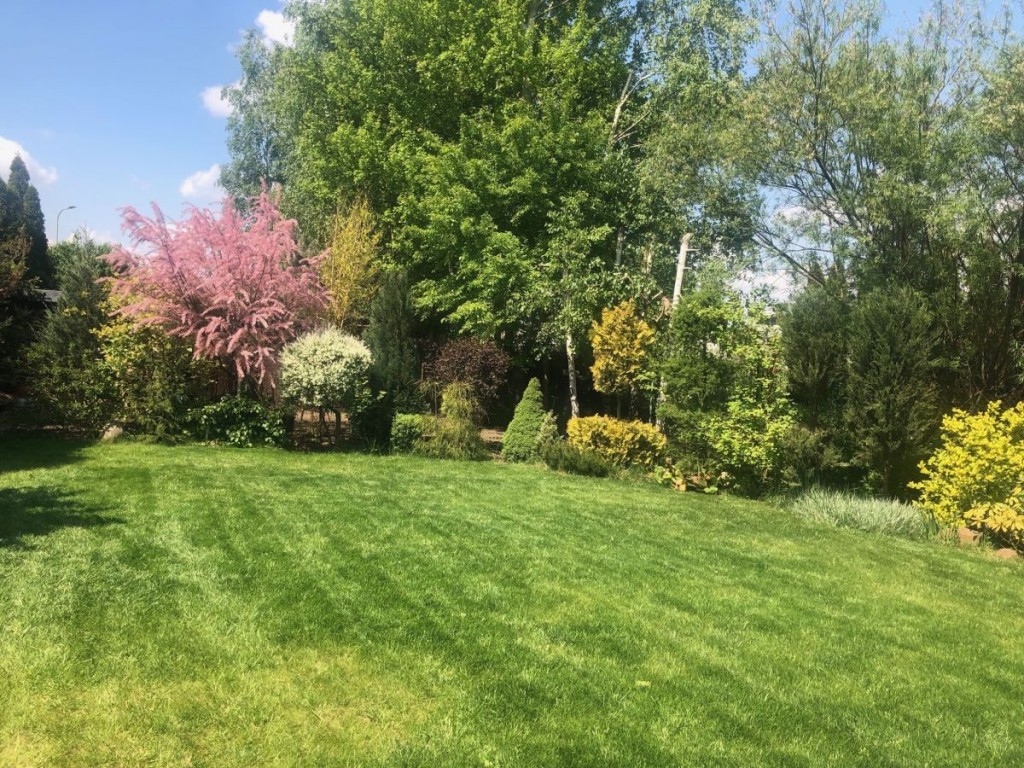 Duży ogród w kształcie prostokąta z ciekawymi roślinami, oświetlony.Można na terenie ogrodu zbudować basen lub boisko. Na terenie ogrodu domek ogrodowy, dwie studnie z ujęciem wody na głębokości 7 oraz 11m.