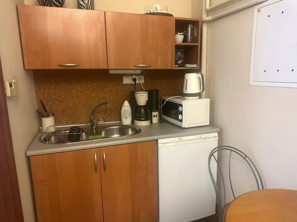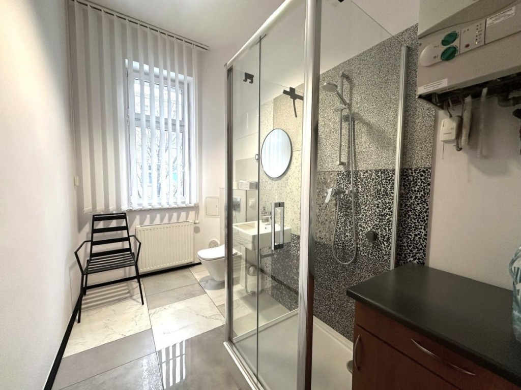 Okna wychodzą na dwie strony świata: zachodnią (wszystkie pokoje) i wschodnią (łazienka). Lokal może być wynajęty z całkowitym umeblowaniem lub bez mebli biurowych.