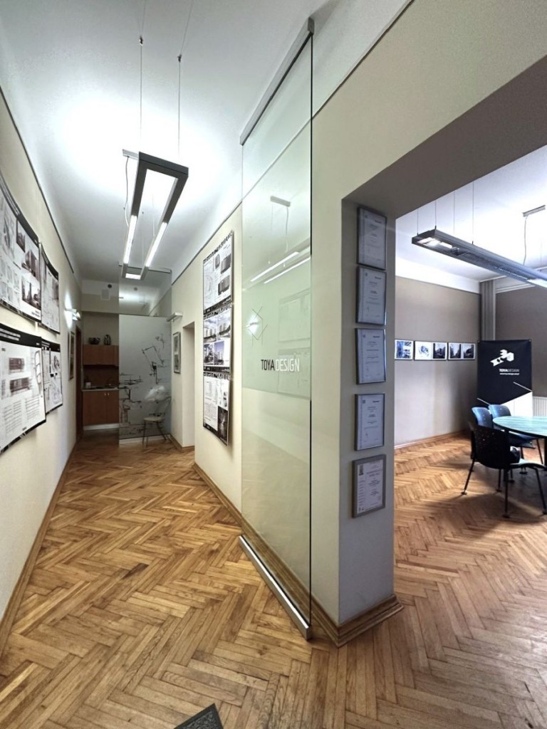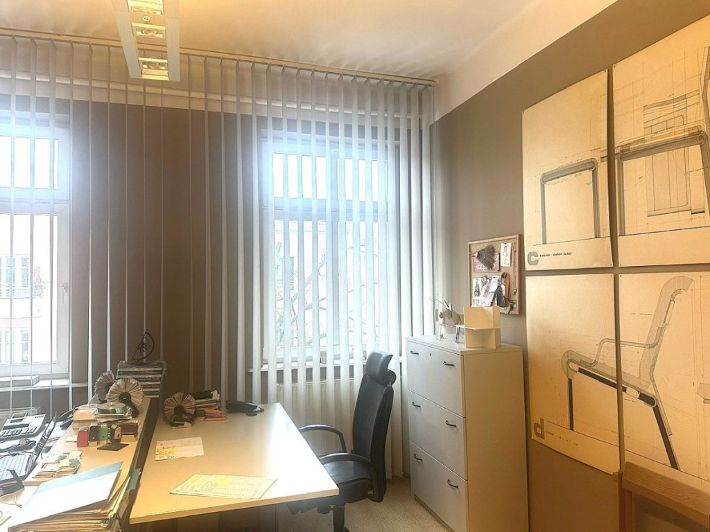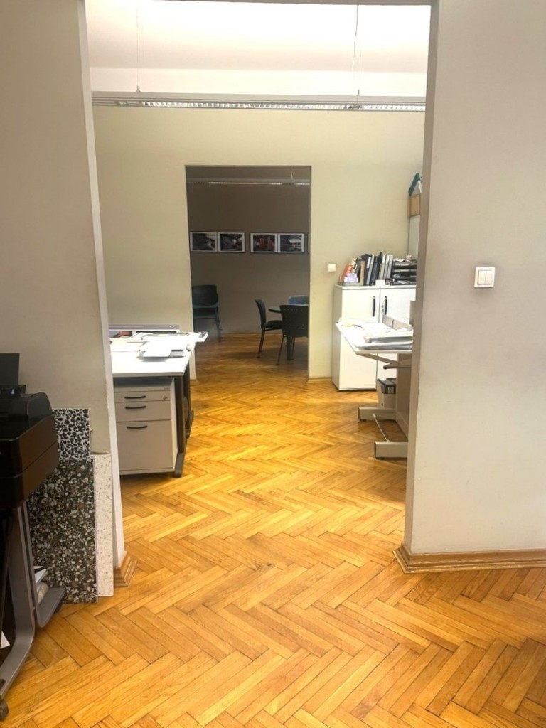 Lokal biurowy o powierzchni ok.114 m2 znajduje się na II piętrze kamienicy z 1928 roku i składa się z 4 pokoi: 26 m2, 22 m2, 22 m2, 22m2, małego aneksu kuchennego, łazienki 5,8 m2 i korytarza.